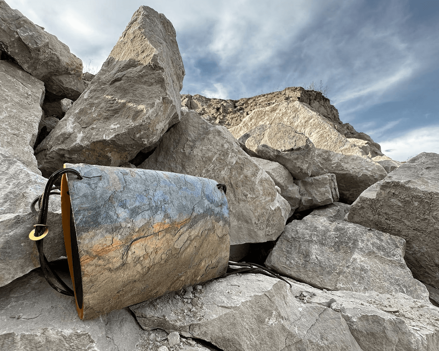 Das Äußere verweist auf geologische Prozesse, ohne sie zu imitieren. Der Innenraum erinnert an einen tektonischen Schnitt durch vulkanische Tiefen. Die Schichtung in leuchtendem Orange setzt die äußere Materialidee im Inneren fort. Die Gestaltung reagiert auf die gegebene Struktur des Schiefers, ohne sie zu kommentieren.